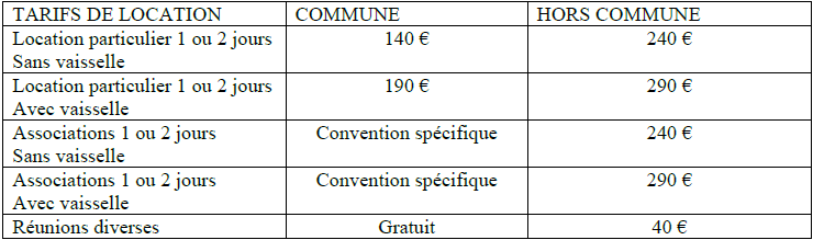 La réservation de la salle des fêtes s’effectue directement auprès du secrétariat de la mairie. Un contrat de location est établi.